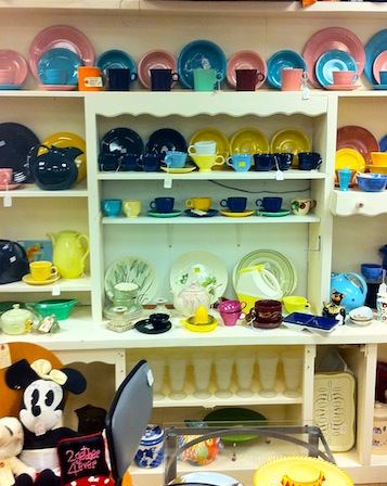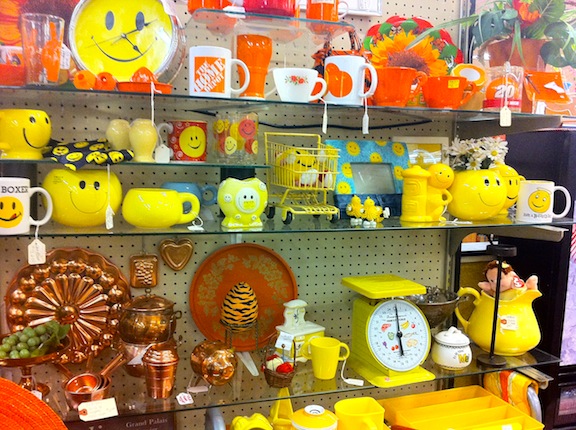 Ties To The Past is in an older strip mall with a Sonic in the middle of the parking lot. The outside looked cute with the painted signs and the mouse but just a tad run-down. No worries, I could not wait to get in and start my treasure hunting. Once inside I was blown away buy the size of this shop…its pretty big, light and bright! There was a nice lady at the counter who said “hello” and could see from the look on my face that this was my first time in and she asked if I was looking for anything in particular and let me know she would be by to check on me and see if I needed any cabinets opened. As I started looking in booths I could tell right away that this shop is a combo of antiques, collectibles, junk, eclectics, new and whimsical items so certainly something for everyone. A couple booths were all setup for Christmas and the Holidays with vintage Santa’s and ornaments and other booth’s had nice selections of dishes and china and also furniture. I even found an entire wall of “really retro” 1970s yellow and orange smiley-face items!! Once I got the hang of how things were setup in this shop I went right through the booths and was done shopping within 1 hour. There were several booths that were almost bare and empty so I don’t know if they were “in transition” as far as coming or going so that cut down on the amount of shopping time as there was not much to see in those booths.